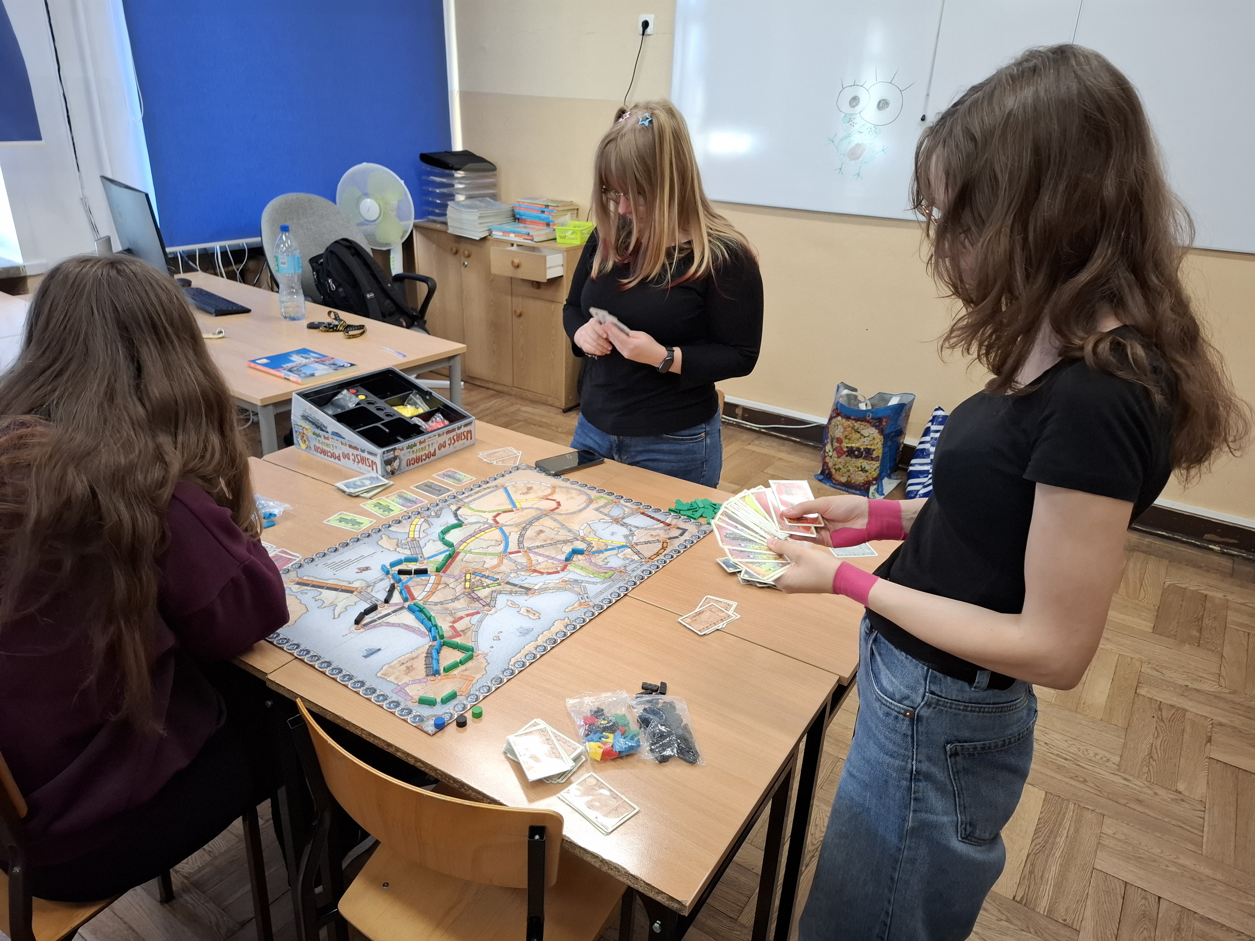 Czwartkowe spotkanie rozpoczęliśmy poszukiwaniami i ćwiczeniem naszej spostrzegawczości, z sukcesem rozgrywając partię w Spy Guy. Przy drugim stole w tym czasie uczniowie zapoznali się z kolejną planszówką i ucząc się gry w Baronię poszerzali swoje terytoria. Oprócz tego zagraliśmy w Catan i nie mogło zabraknąć naszego dotychczasowego ulubieńca, czyli gry Wsiąść do pociągu - Europa:)