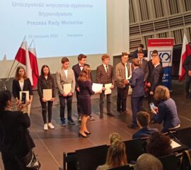 W dniu 30.11.2022r. w Auli Menedżerskiej Akademii Nauk Stosowanych przy ulicy Kawęczyńskiej 36 w Warszawie odbyło się uroczyste wręczenie uczniom szkół ponadpodstawowych Stypendium Prezesa Rady Ministrów. Z naszej szkoły stypendium otrzymały uczennice Wiktoria Gruda z kl. 4ET-p oraz Oliwia Kurek z kl. 4ET, które w ubiegłym roku szkolnym uzyskały najwyższe wyniki w nauce i wzorowe zachowanie.